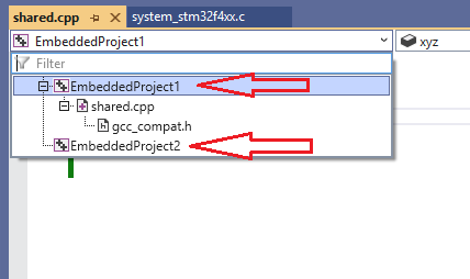 Currently, switching between the projects works out-of-the-box, as long as they are separate projects on the Visual Studio level (e.g. MSBuild, Legacy GNU Make). The GUI for switching is similar to the regular Visual Studio’s one: